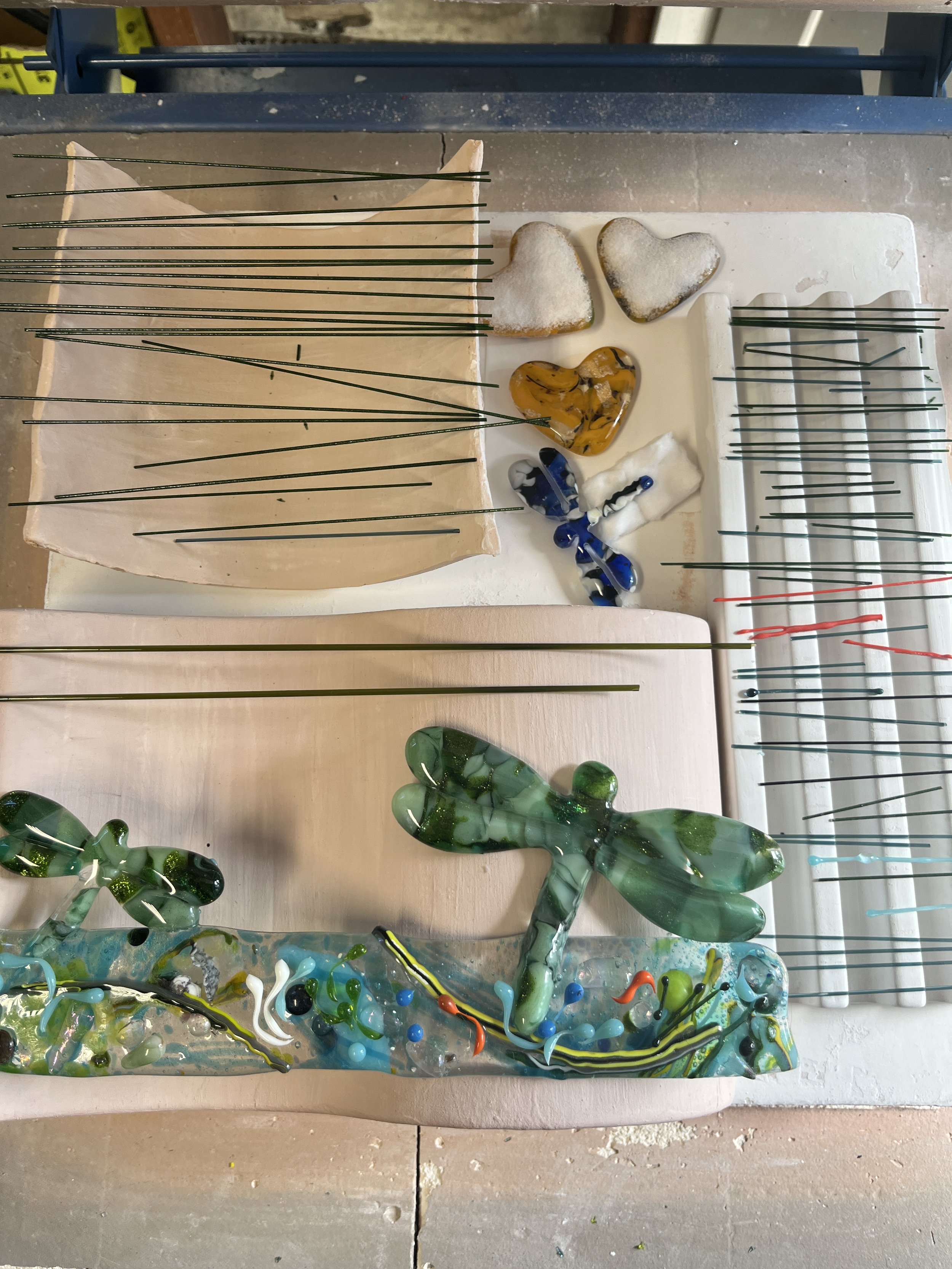 The process of creating these beautiful dragonfly stands is a multistep process. I begin with a mold for the dragonflys and creating the base glass. They are then fused together in a with a tack fuse along with extra glass elements to give them texture and sparkel. Each one is unique.